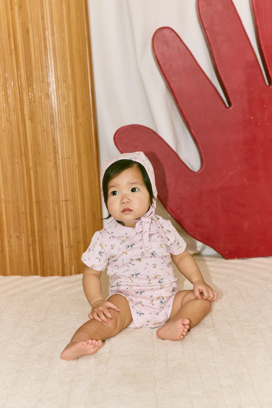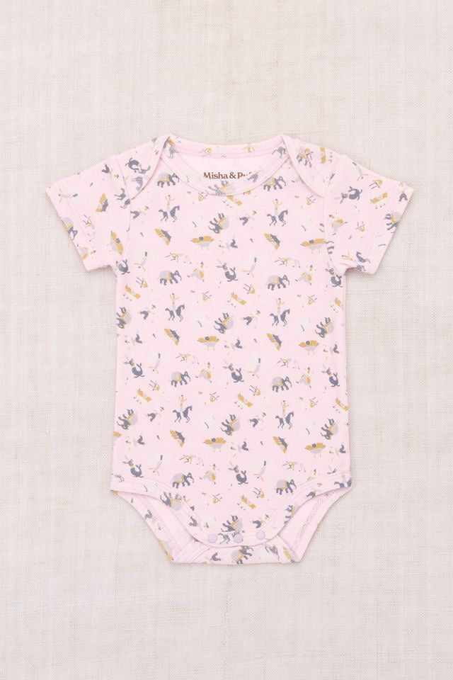 A short-sleeved onesie in soft organic Pima cotton, featuring lap-shoulder detail and snap closure at the bottom.