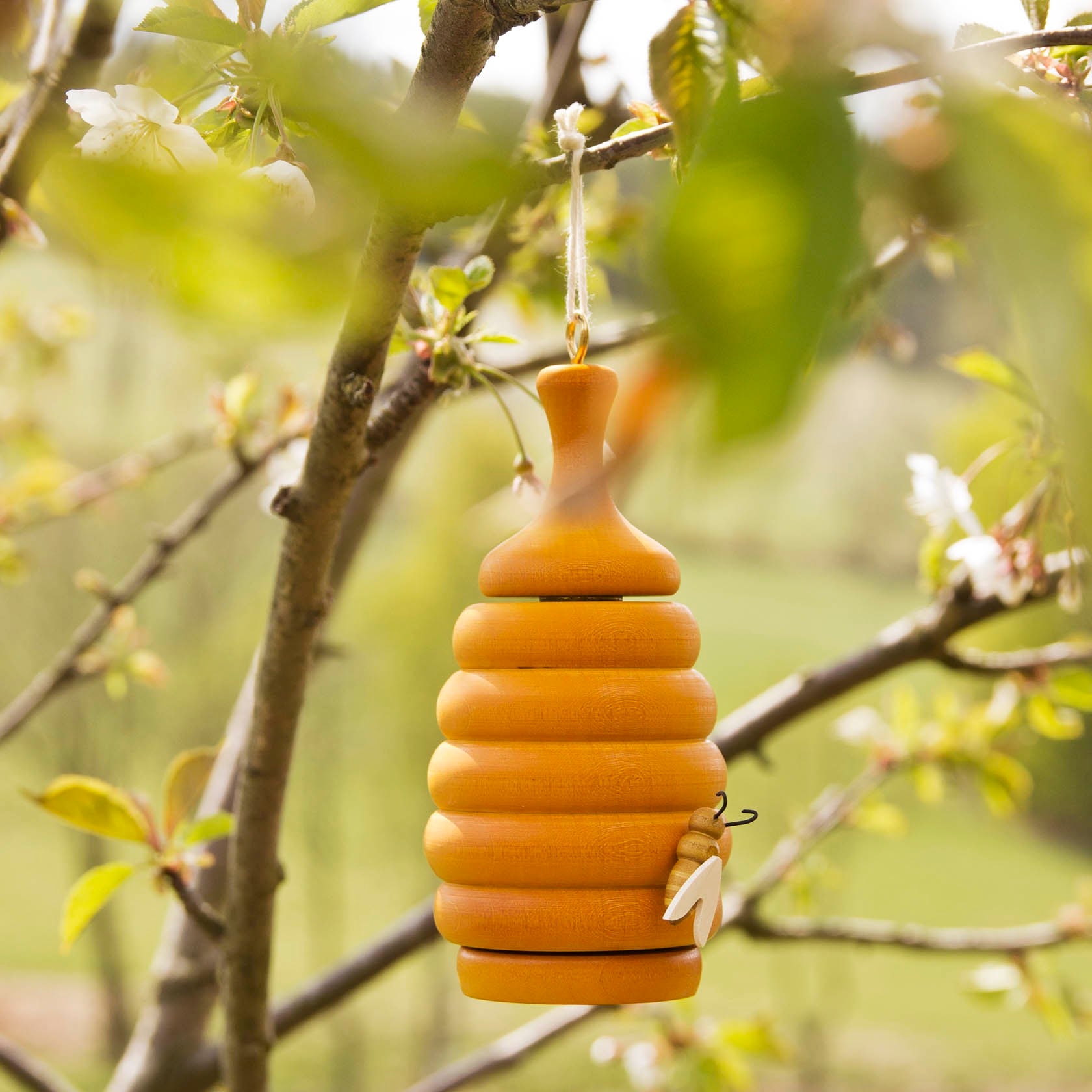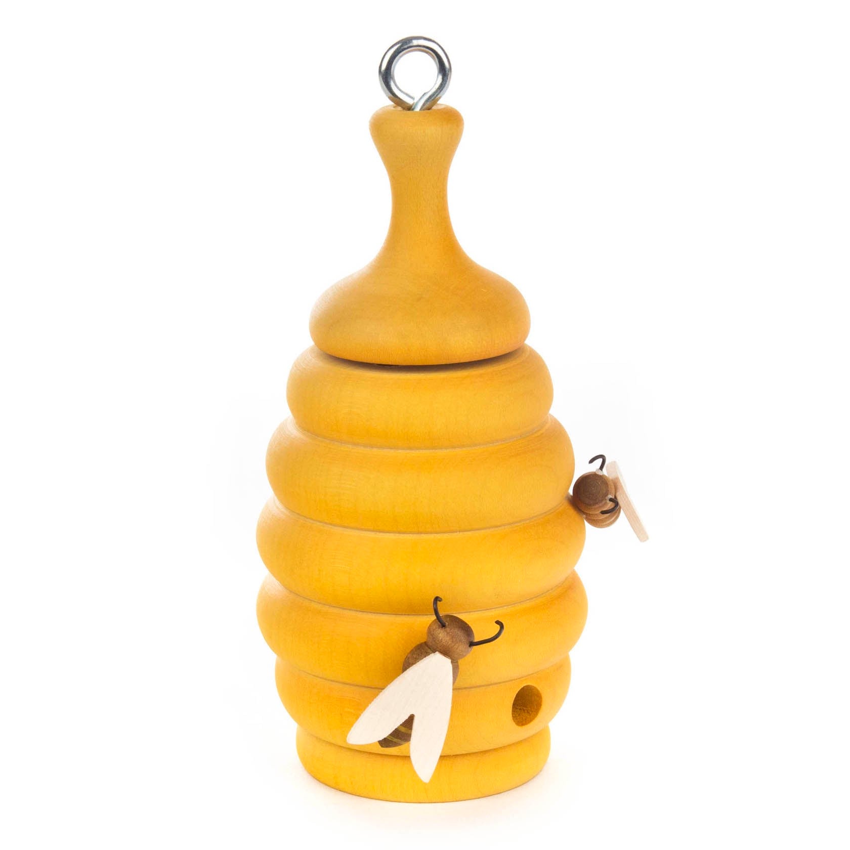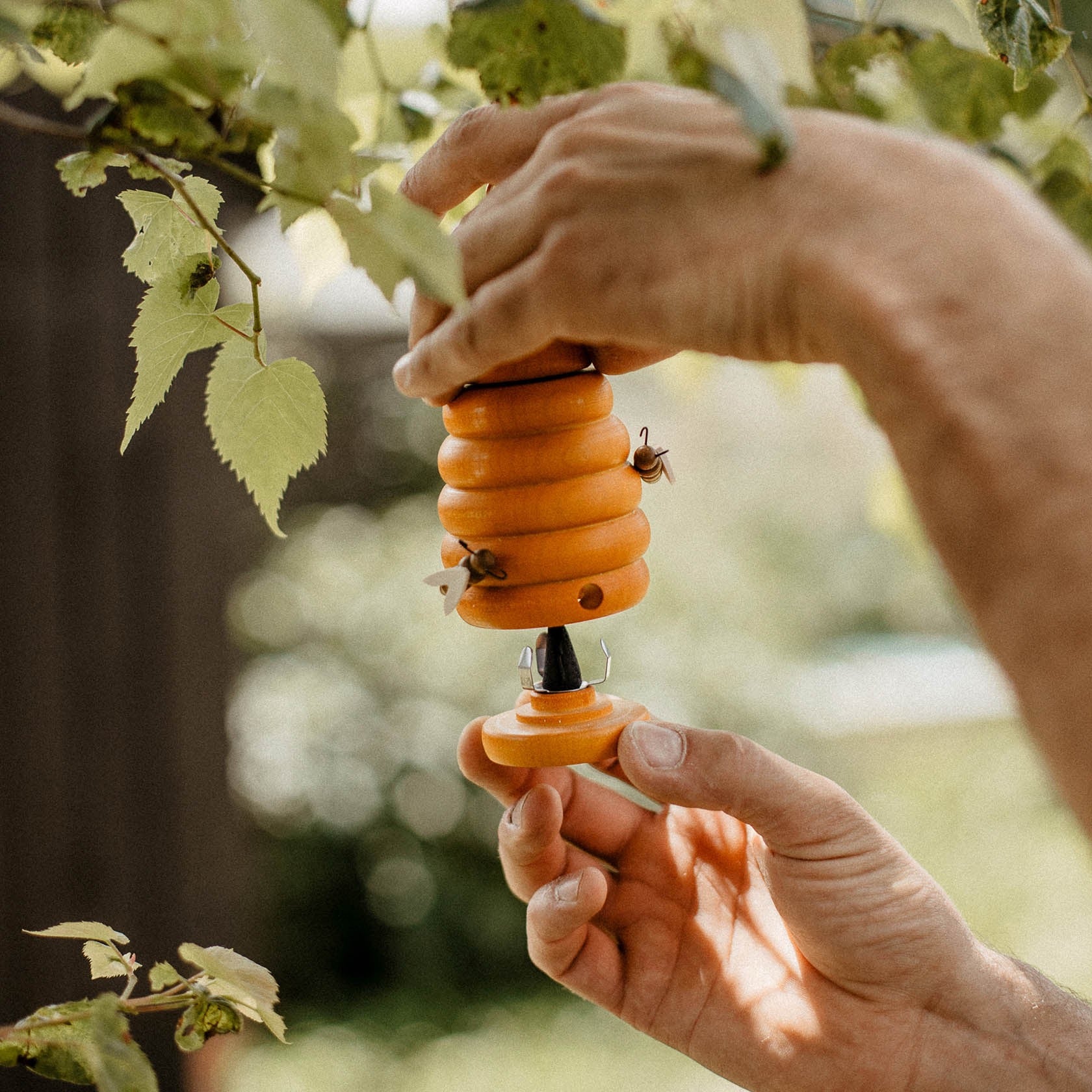 This wooden beehive with a smoking function is suitable for placing or hanging. The small bees adorning the smoking house are particularly cute. Lift the beehive, place the incense cone on the metal plate, light it, and then place the beehive back on.