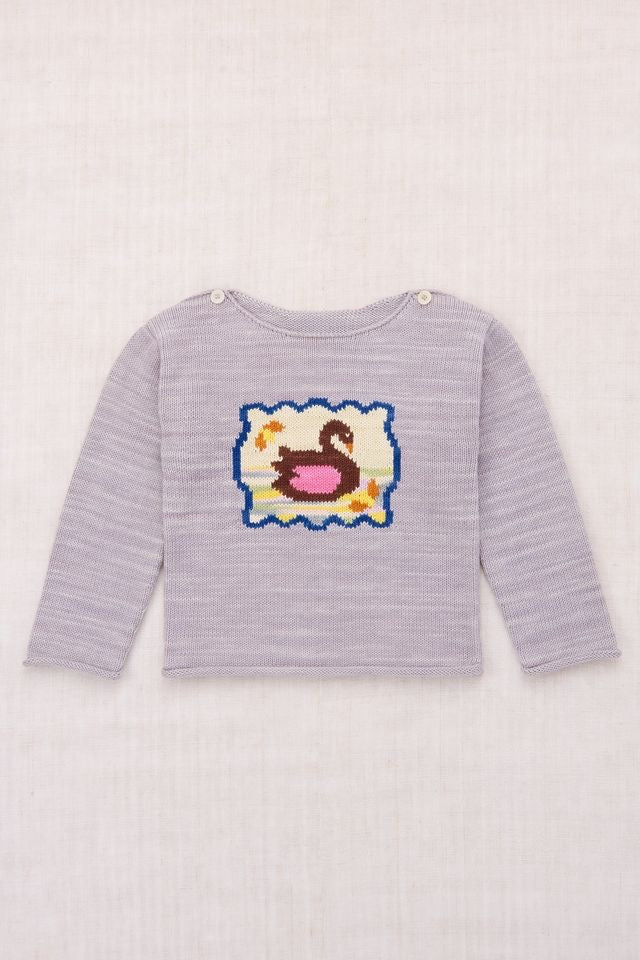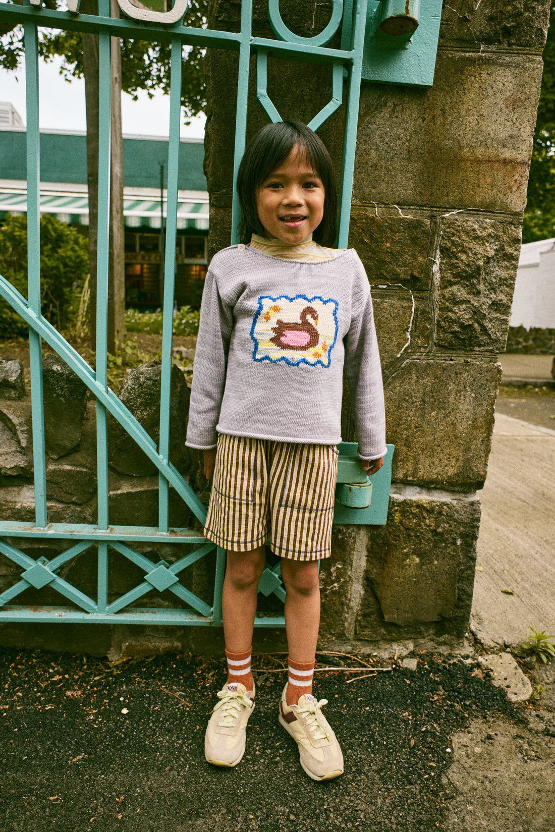 A boatneck sweater in Pima cotton, featuring a graphic intarsia and corozo buttons at the shoulder.