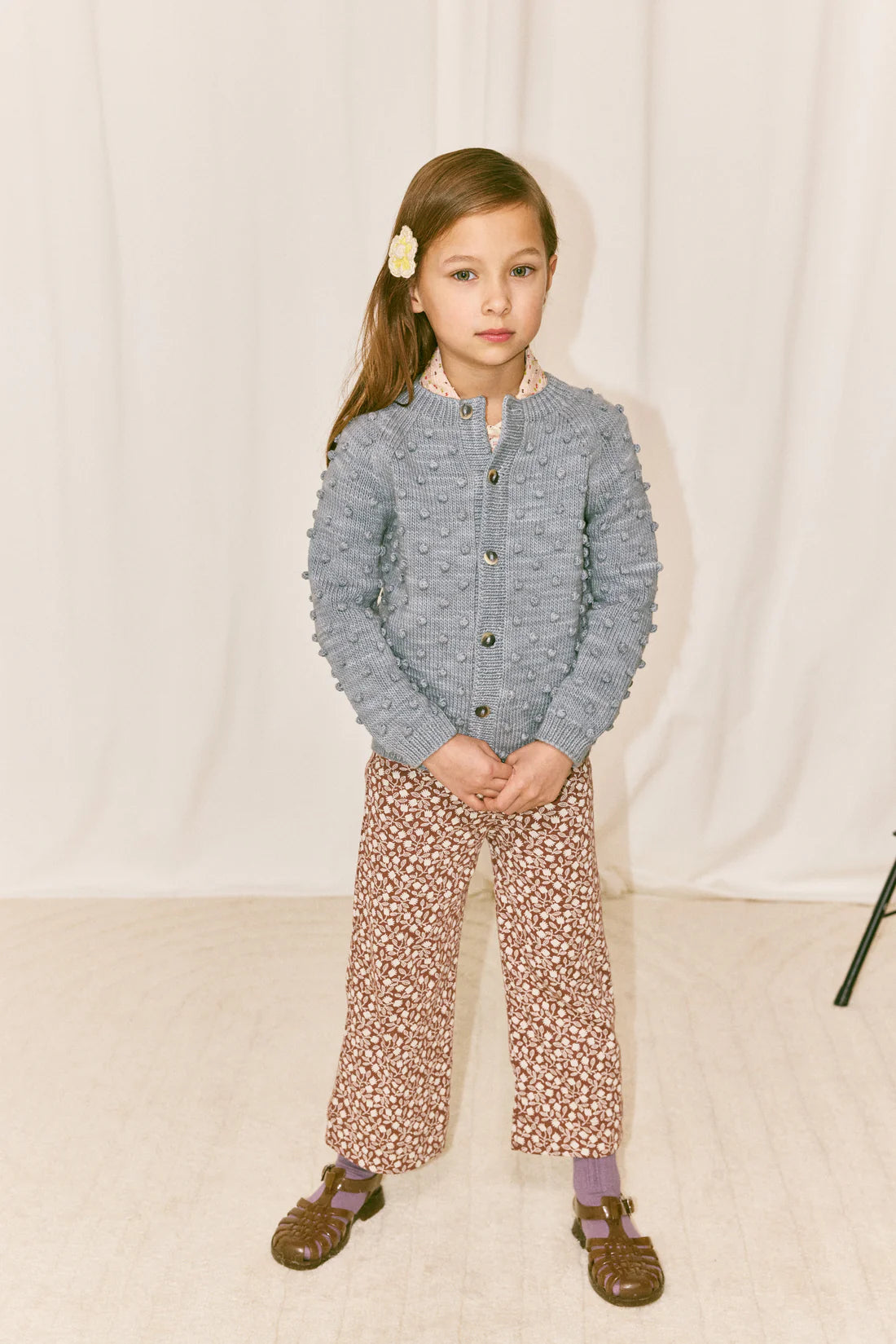 A roomy hand-knit cardigan in Pima cotton, featuring our signature all-over popcorn stitch, with a cozy silhouette, ribbed trim, and horn button closure.