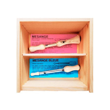 The blue tit is a singer—sometimes nervous, sometimes capricious, sometimes charmeuse. To play its song, start by blowing twice, then pull the plunger after the second hole and blow again: “Tu-tu … iii …”. Repeat this process several times. Once the bird “listens” to you, your talent show begins, thanks to the many possibilities this bird call offers.