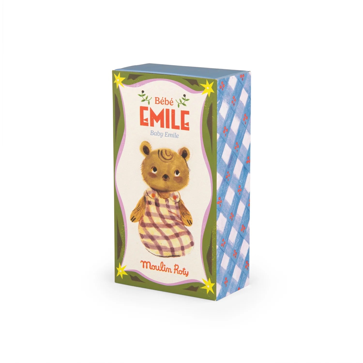 Baby Émile dreams of becoming a butterfly hunter. He has a real sweet tooth and loves towering cakes in every colour of the rainbow. With his bendable legs, he can sit up, and his cosy checked sleep sack is fastened with velcro for easy removal.