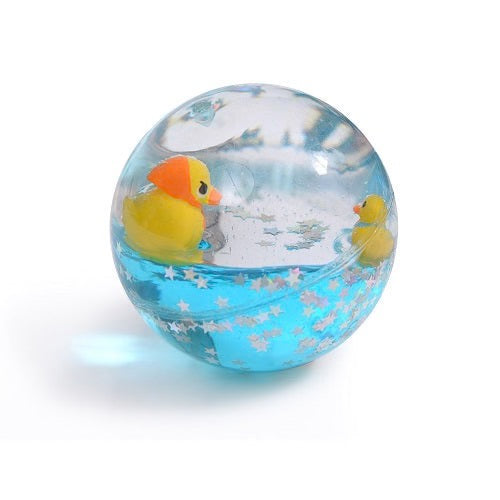 Bouncing ball filled with colored liquid, where we see a duck bathing in the middle of shining stars! Measures approx 6 x 6 cm. Safety rated for children 3 years old +.