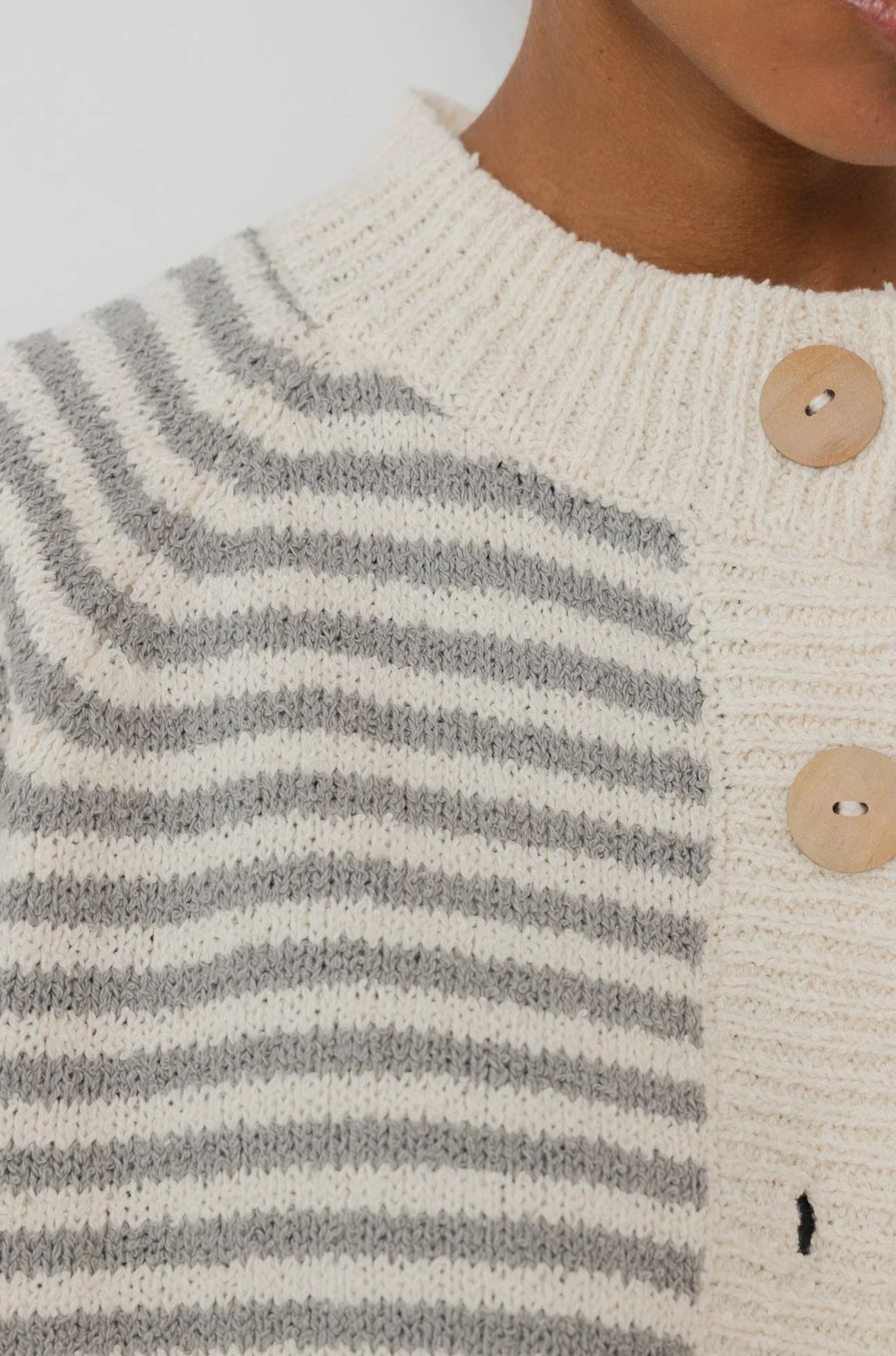 Our beloved summer bomber in a boucle textured stripe. Cropped and boxy body with unvarnished wood buttons and rib edges. The boucle yarn is softly textured with a dry hand feel.