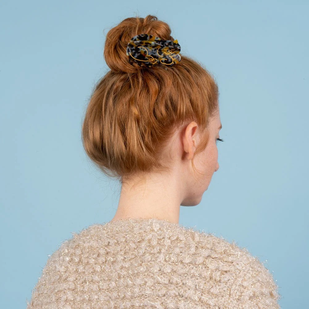 This big brown, white and black hair claw will keep your bun perfect all day long. Isa is here for you!