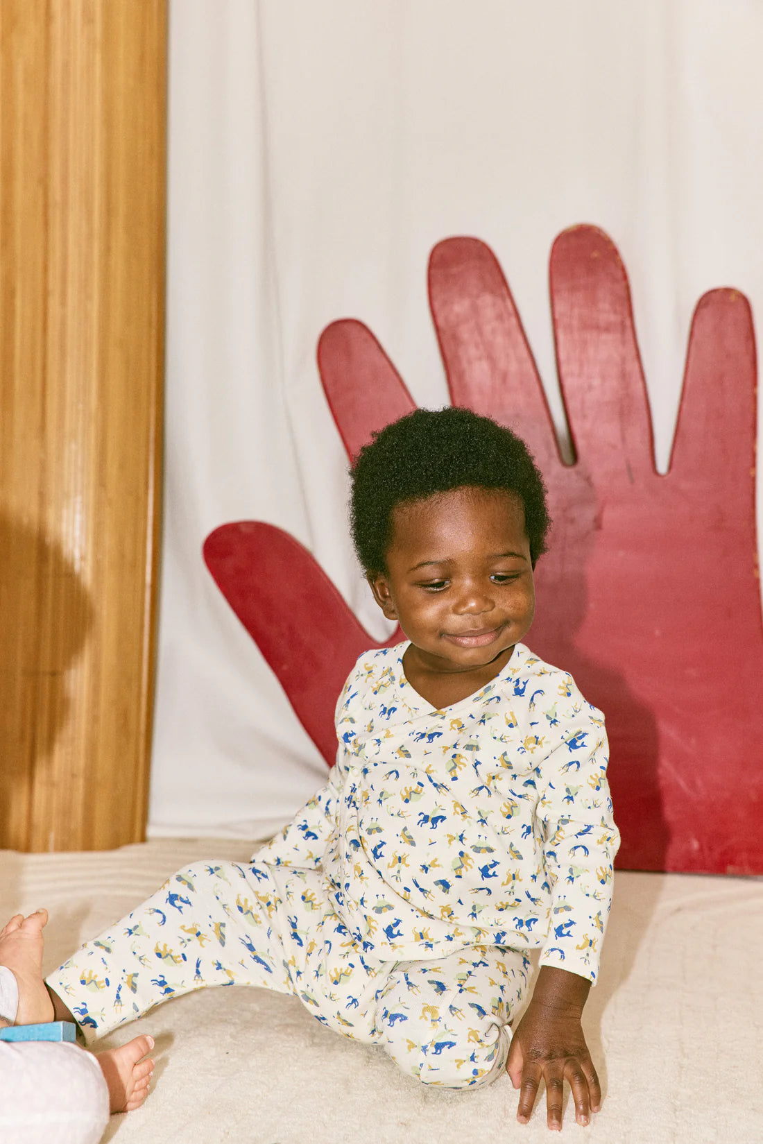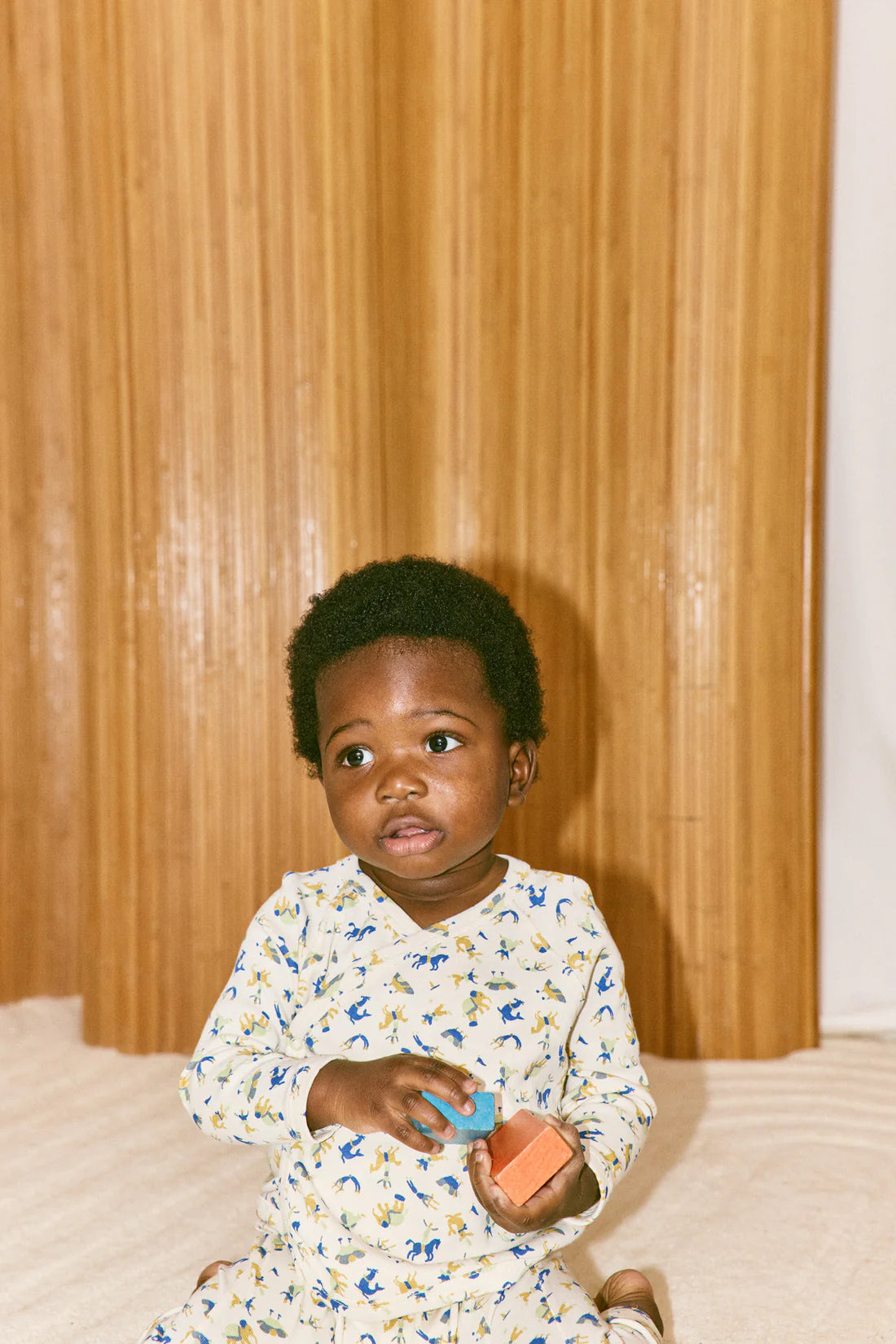 A set in soft organic Pima cotton, featuring a long-sleeved wrap top with a front snap closure and easy pull-on bottoms.