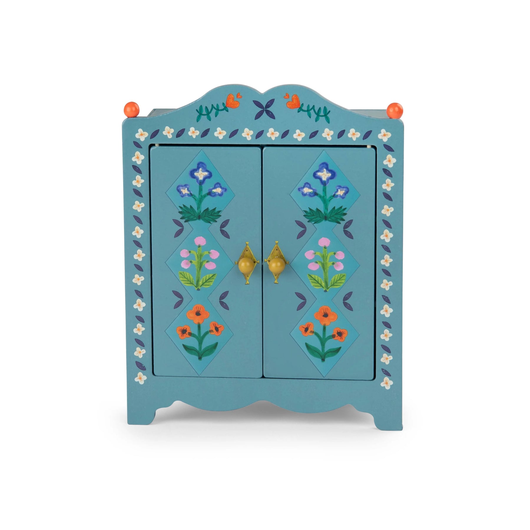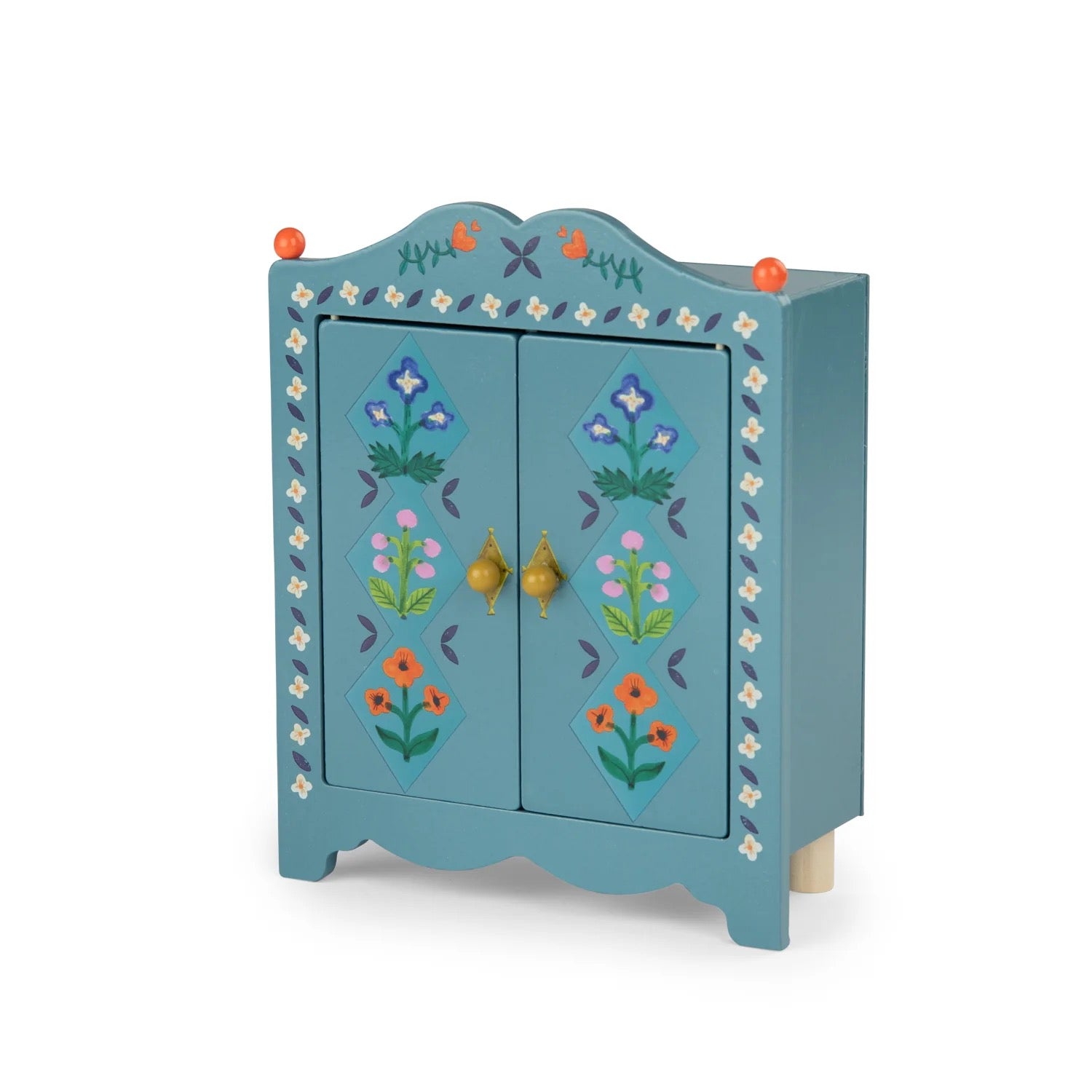 Pablo’s woolly hat is hiding somewhere — or maybe right on his head! This charming wooden wardrobe features a magnetic closure and three little hangers, perfect for storing tiny clothes and accessories. (Animals sold separately.)