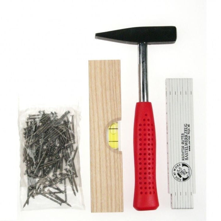 Règle de dossier, marteau de charpentier, niveau à bulle en bois et clous.