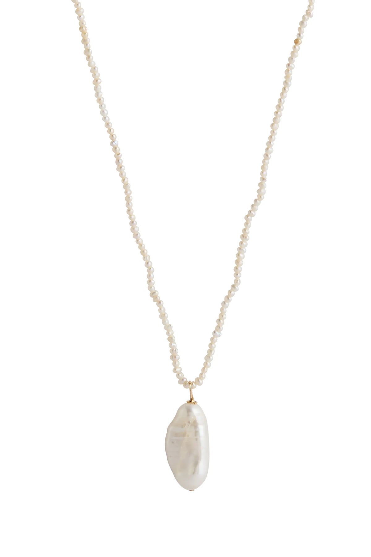 Our Millen necklace feautures a hand strung chain of tiny fresh water pearls adorned by a large, organic Fresh Water Pearl pendant and secured by a lobster clasp closure made of 14k Gold Filled.