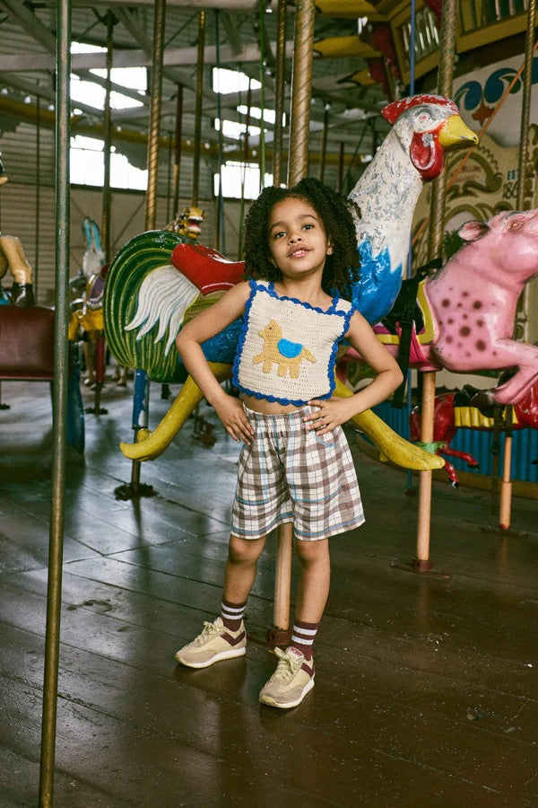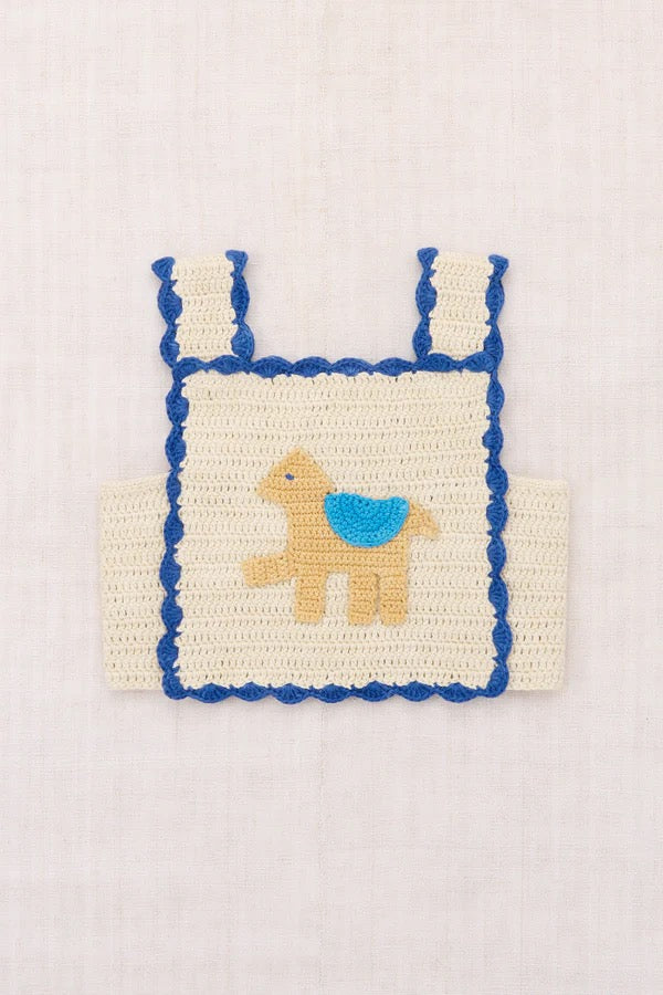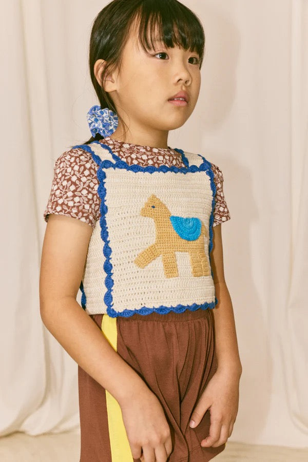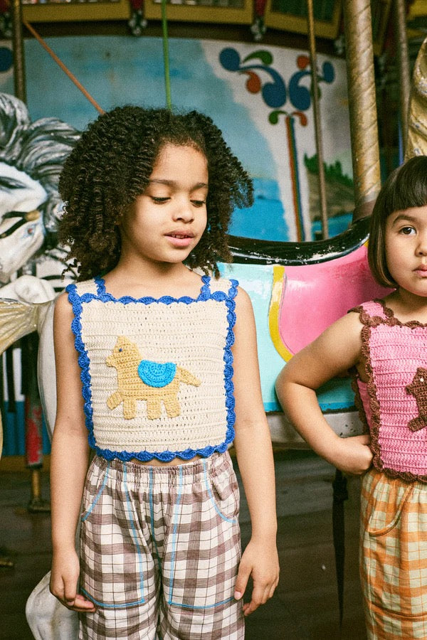 A boxy, pullover hand-crocheted tank top in Pima cotton, with contrast scalloped edge detail and finished with a hand-crocheted appliqué motif. A show-stopping piece — perfect for layering.