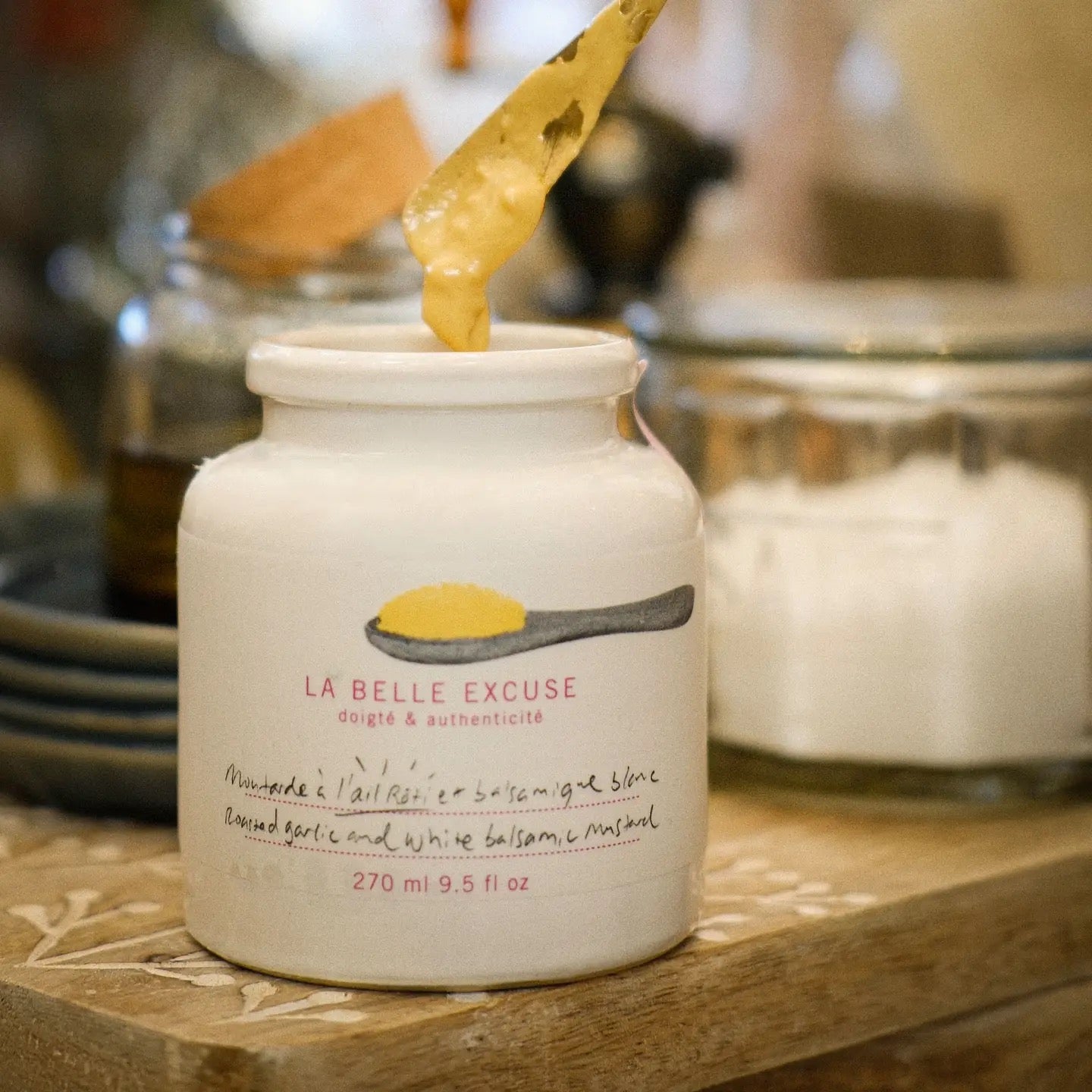 LA BELLE EXCUSE offers you a tasty mustard with olive oil, roasted garlic, and white balsamic vinegar. Emulsified with La Belle Excuse green olive oil, this delicious mustard has a rich creamy texture, enhanced by the subtle aroma of roasted garlic and the tangy sweetness of white balsamic vinegar. A natural artisanal mustard to liven up all your favorite dishes! Your taste buds and guests will be delighted. Its appetizing name also happens to be the entire list of ingredients :-)